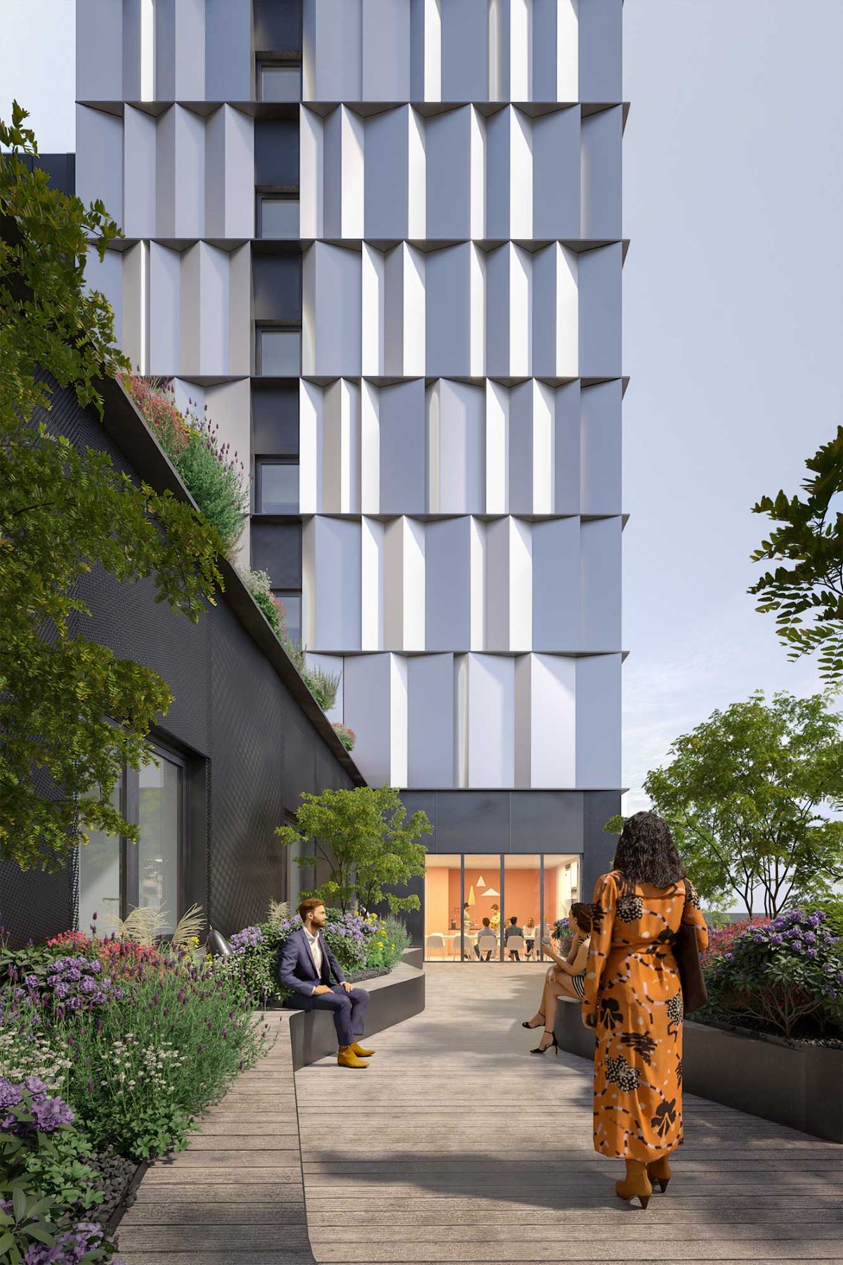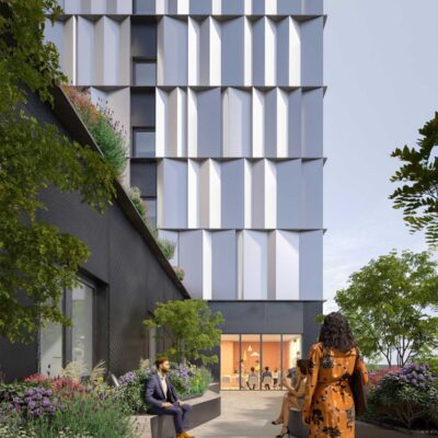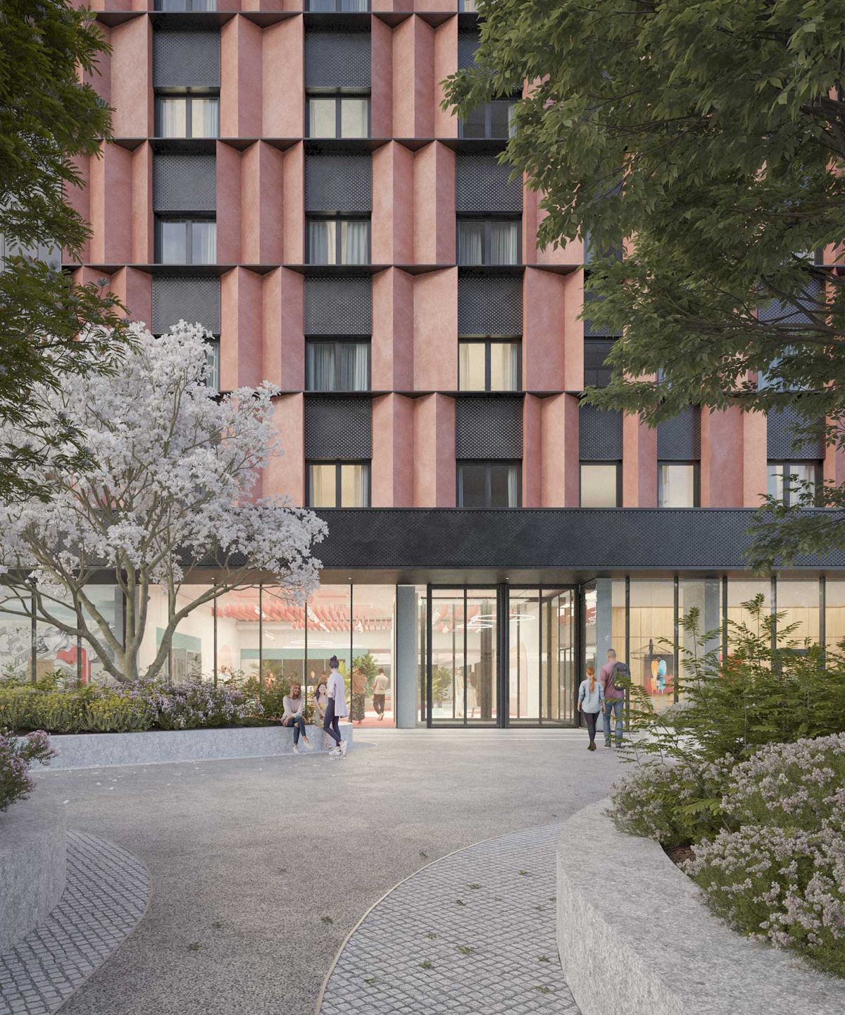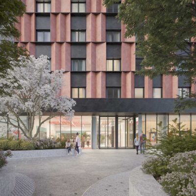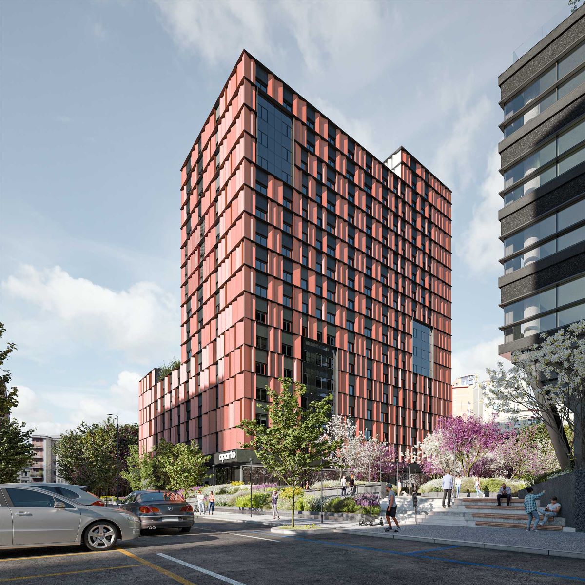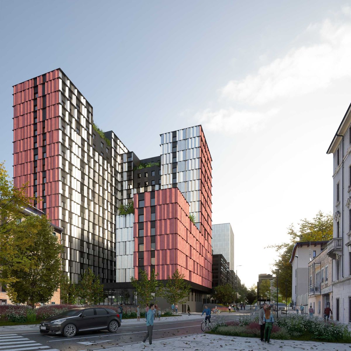 Lo studentato in costruzione, con progetto architettonico di Park, si articola in un blocco aperto verso la città. È formato da un volume ad L che si innesta su un podio, creando una corte che ottimizza l’esposizione solare. In sommità ci saranno terrazze comuni verdi e panoramiche.
