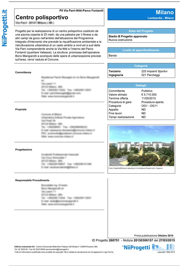 Pubblicato il bando della Borio Mangiarotti srl con scadenza 11/05/2015 per la realizzazione di un centro polisportivo costituito da una piscina di 25 mt, da una palestra per il fitness e da altri campi da gioco nell’ambito dell’attuazione del programma Integrato d’Intervento che prevede la riqualificazione ambientale e la ristrutturazione urbanistica in un vasto ambito a nord e sud di Via Parri a Milano. L’importo complessivo del bando è di € 5.709.654,10.
