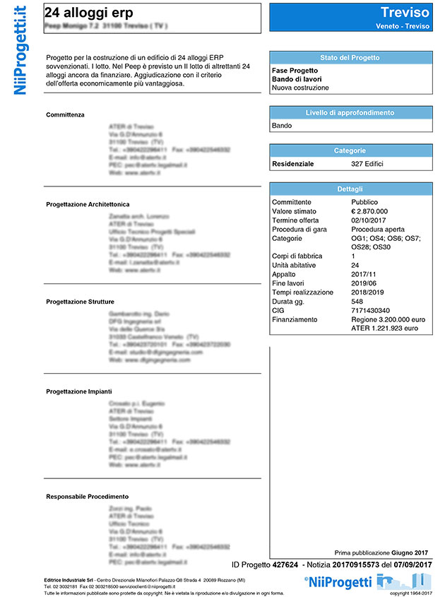 L’ATER di Treviso ha pubblicato un bando per la realizzazione di un edificio per complessivi 24 alloggi ERP a Treviso in località PEEP 7.2 per un importo di € 2.870.000. La progettazione è stata redatta dall’ATER di Treviso. Responsabile ing. Paolo Zorzi dell’ATER. Scadenza presentazione offerte 02/10/2017. CIG 7171430340.