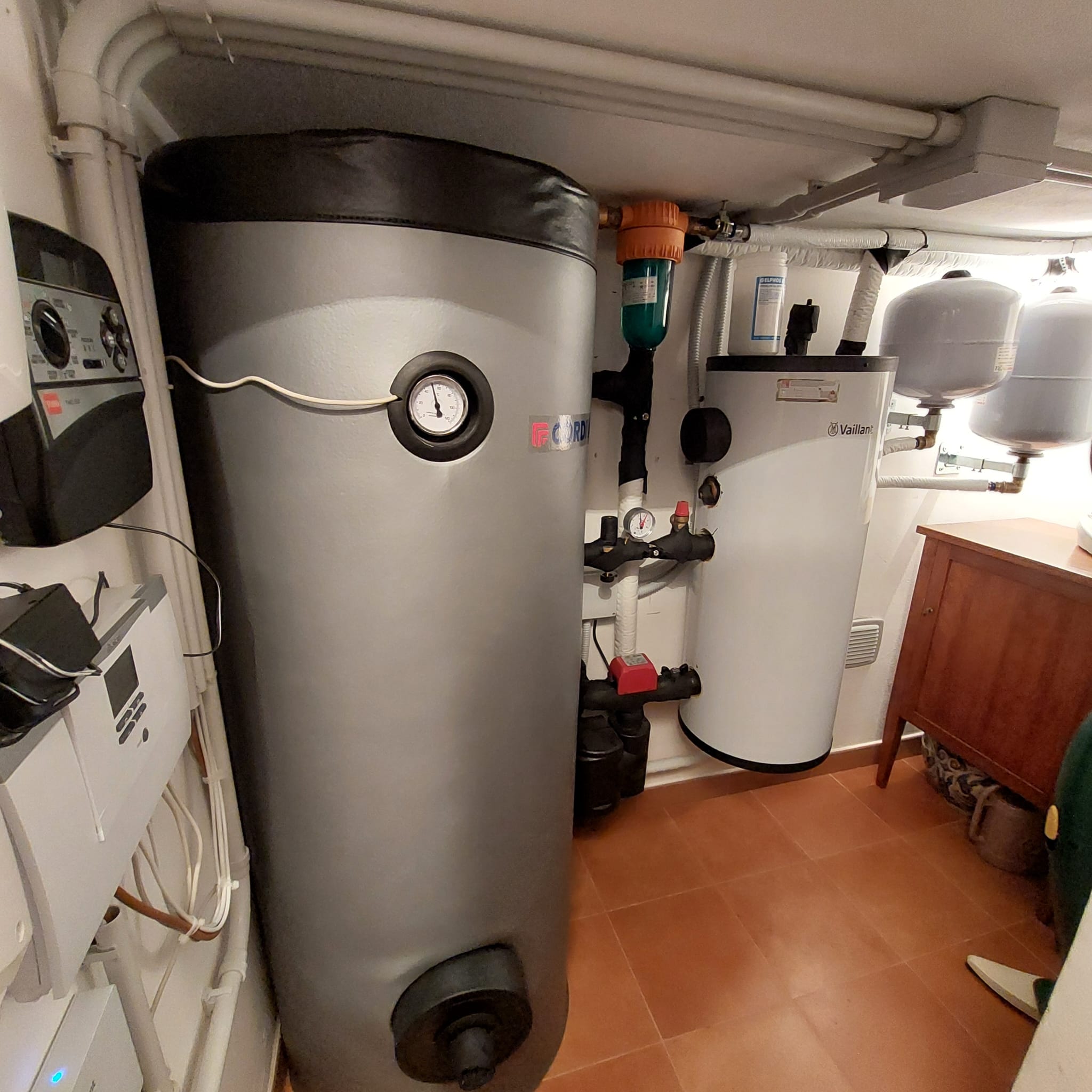 In questo caso, il precedente sistema è stato sostituito da Vaillant con una pompa di calore monoblocco aroTHERM plus R290 da 12 kW 230V, abbinata a un puffer da 45 litri VP RW 45/2 e a un accumulo ACS di terze parti da 200 litri. Il nuovo impianto è stato integrato con i radiatori già presenti nell’abitazione, dimostrando la flessibilità della soluzione anche in edifici non di nuova costruzione.