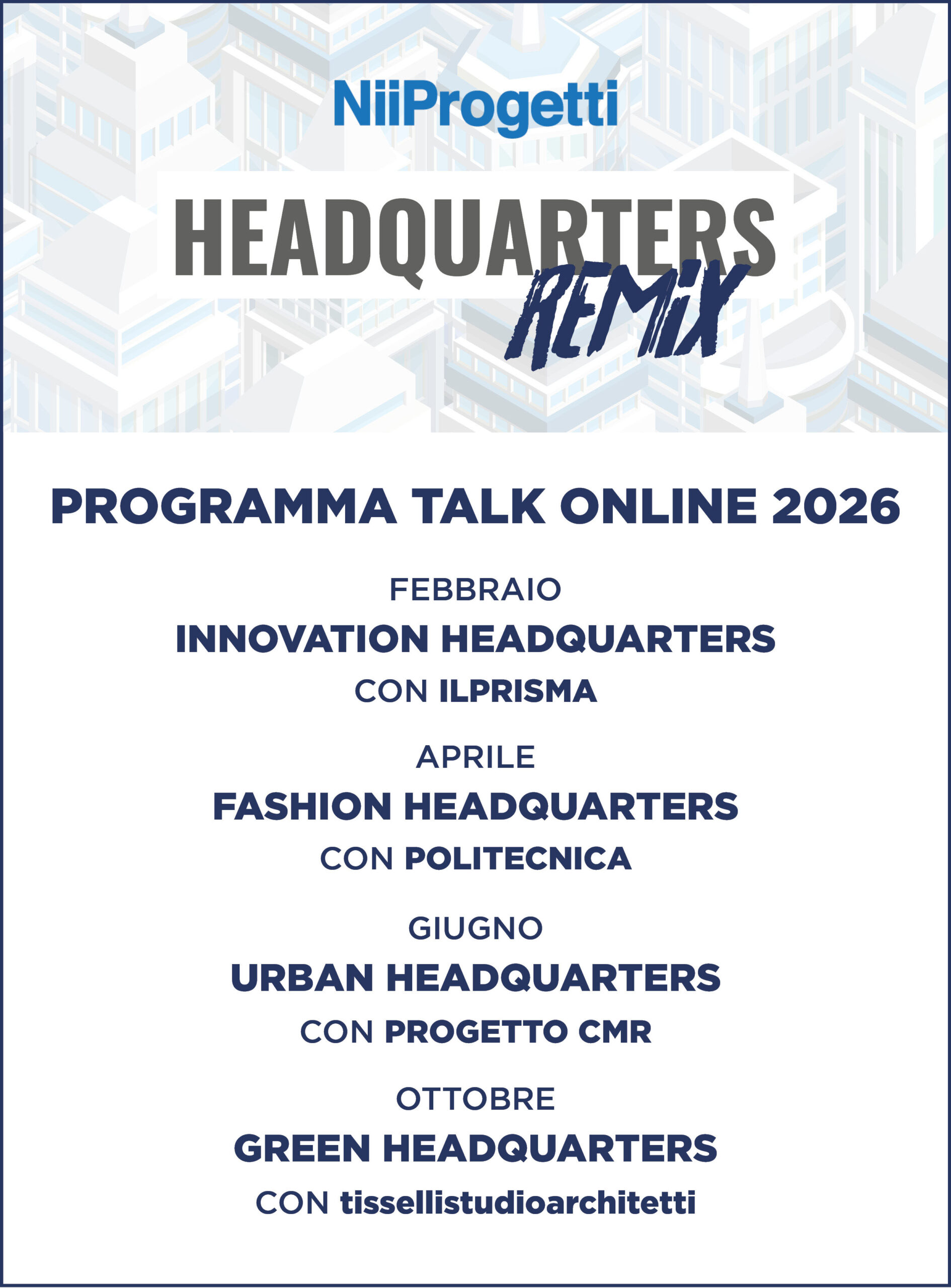Con l’obiettivo di approfondire caratteri e tendenze di un settore di progettazione così sfaccettato attraverso il confronto con i suoi protagonisti, nel 2026 NiiProgetti presenta HEADQUARTERS REMIX, un ciclo di 4 talk online – che culmineranno in un esclusivo evento finale in presenza – durante i quali quattro grandi studi di architettura, in dialogo con aziende e fornitori, racconteranno alcuni progetti innovativi per concept, sviluppo e capacità di rispondere alle specifiche esigenze della committenza proponendo nuovi modi di pensare e vivere il workplace.