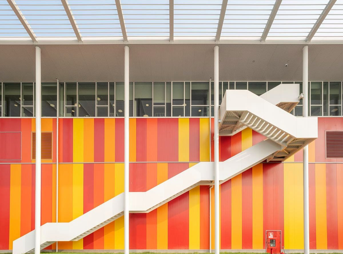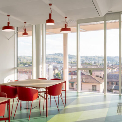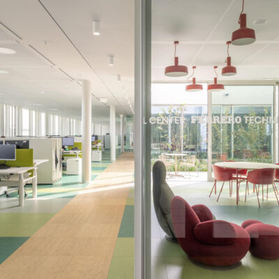 Appena entrati nell’edificio, infatti, ci si trova subito in una grande hall a tutt’altezza interamente vetrata. Qui si fa subito notare la scala metallica di un rosso acceso che attraversa l’intero volume come una sorta di passeggiata sospesa in grado di regalare a chi la percorre una prima vista su alcune delle attività nel cuore dell’edificio: sulla tripla altezza della hall si affacciano, infatti, le ampie vetrate dei mezzanini, locali che ospitano zone sperimentali, sale riunioni, uffici per i consulenti, un’area relax e gli spogliatoi per il personale.