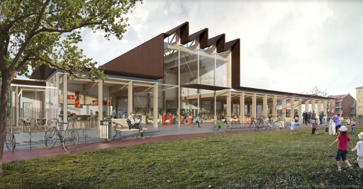 La Biblioteca di Alice sorgerà nell’area verde del parco Golese nel quartiere Pablo. La superficie di 670 mq su un unico livello sarà particolarmente dedicata ai bambini e ai ragazzi.