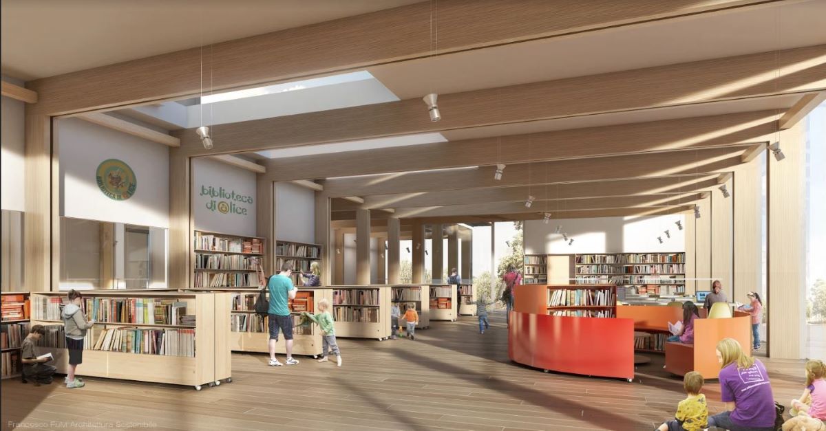 Oltre allo spazio di accoglienza all’ingresso, ci sarà un banco per il prestito, un angolo emeroteca e una postazione per la consultazione del catalogo. Ci sarà poi un ampio spazio direttamente collegato all’esterno tramite una serra solare, al quale si aggiungeranno un open space e un’area dedicata agli adolescenti con luoghi di aggregazione e per il lavoro di gruppo. È previsto anche uno spazio laboratorio per attività ludiche collocato all’estremità sud ovest e aperto verso l’esterno per attività di pittura all’aria aperta nella bella stagione.