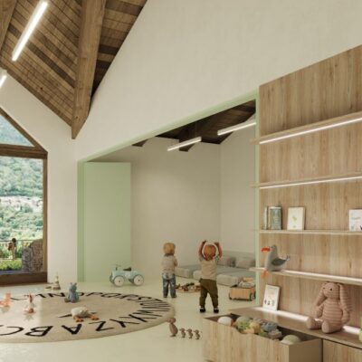 Il nido nel blocco a monte avrà dimensioni più contenute e sarà dotato di un cortile interno protetto. La scuola dell’infanzia nel blocco a valle ha dimensioni maggiori e ampi spazi di gioco all’aperto. I due blocchi sono connessi da un corpo laterale di collegamento con locali tecnici, magazzini e spazi distributivi.