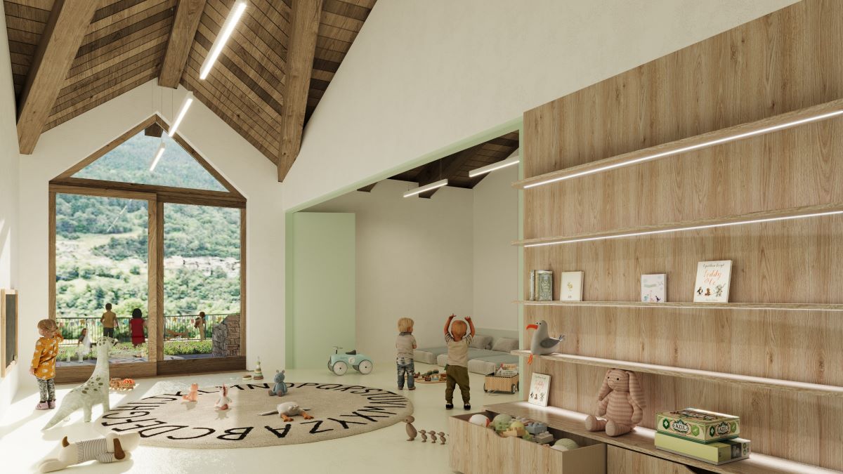 Il nido nel blocco a monte avrà dimensioni più contenute e sarà dotato di un cortile interno protetto. La scuola dell’infanzia nel blocco a valle ha dimensioni maggiori e ampi spazi di gioco all’aperto. I due blocchi sono connessi da un corpo laterale di collegamento con locali tecnici, magazzini e spazi distributivi.