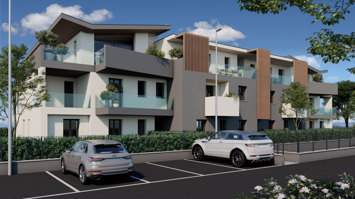 Le facciate saranno intonacate e tinteggiate in bianco o grigio, i serramenti saranno in pvc color grigio antracite con tapparelle in alluminio grigio antracite. I parapetti dei balconi saranno in parte in vetro trasparente con fissaggio alla base e in parte pieni in c.a.