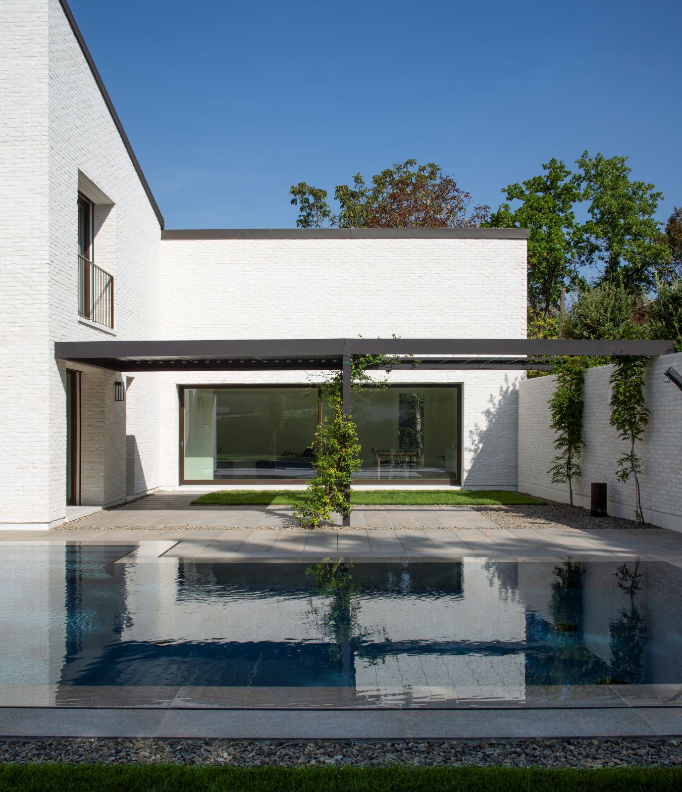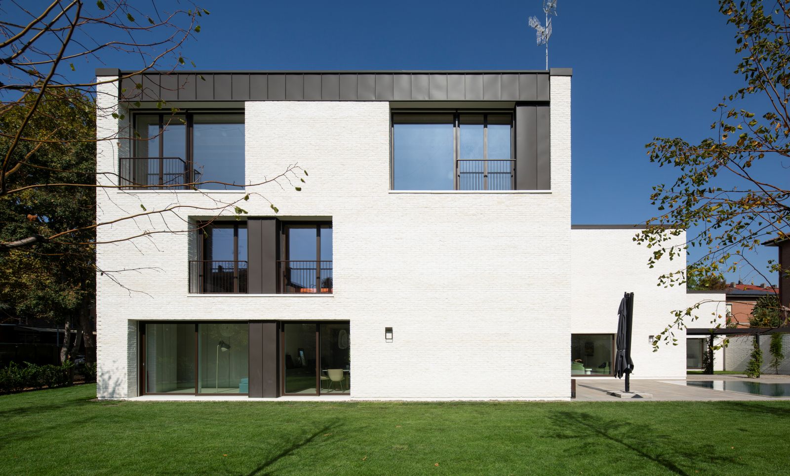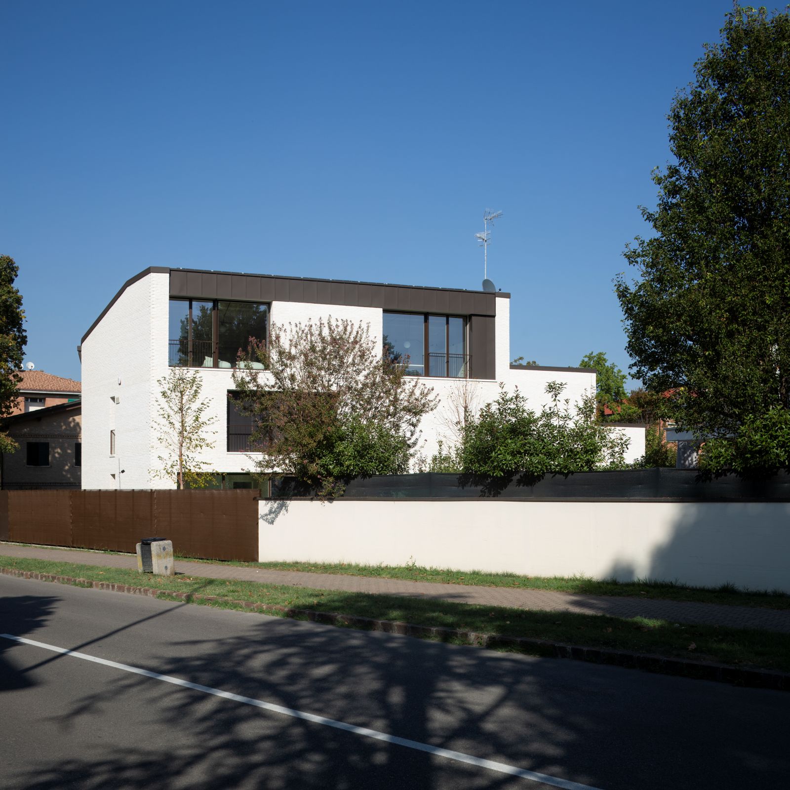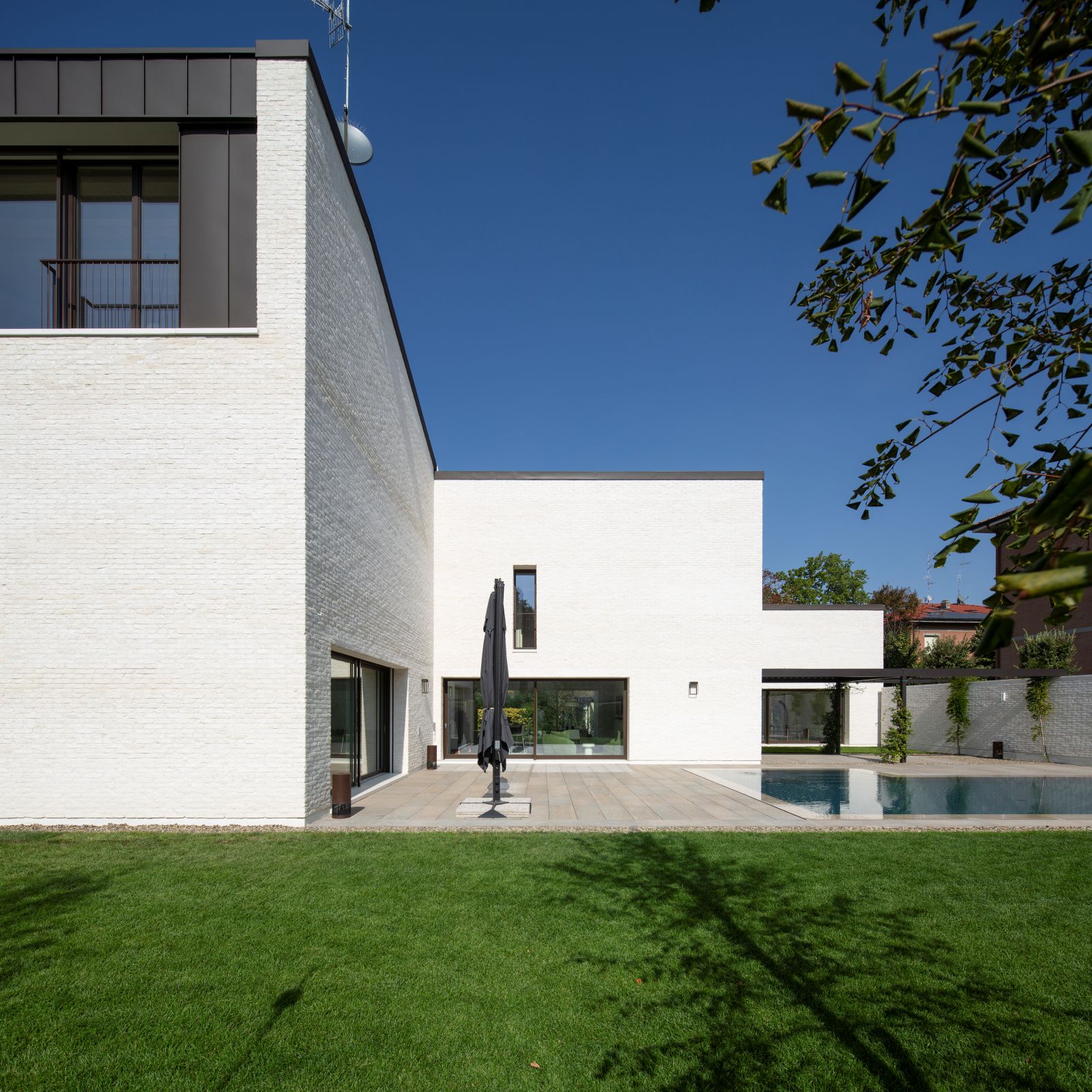 L’idea guida rifiuta la soluzione più consueta, un volume compatto isolato al centro del terreno, per svilupparsi invece attraverso tre corpi di fabbrica progressivamente più alti verso la profondità del lotto. I volumi, leggermente traslati tra loro, compongono così una figura dinamica ma riconducibile a un’unica unità grazie alle coperture mono-falda che si rincorrono come un unico grande tetto. La scelta richiama le aggregazioni additive delle case coloniche della Pianura Padana, dove l’abitazione principale cresceva nel tempo per giustapposizioni successive, mantenendo una lettura organica del costruito. Anche l’uso di un solo materiale contribuisce a rafforzare questo legame con la tradizione locale.