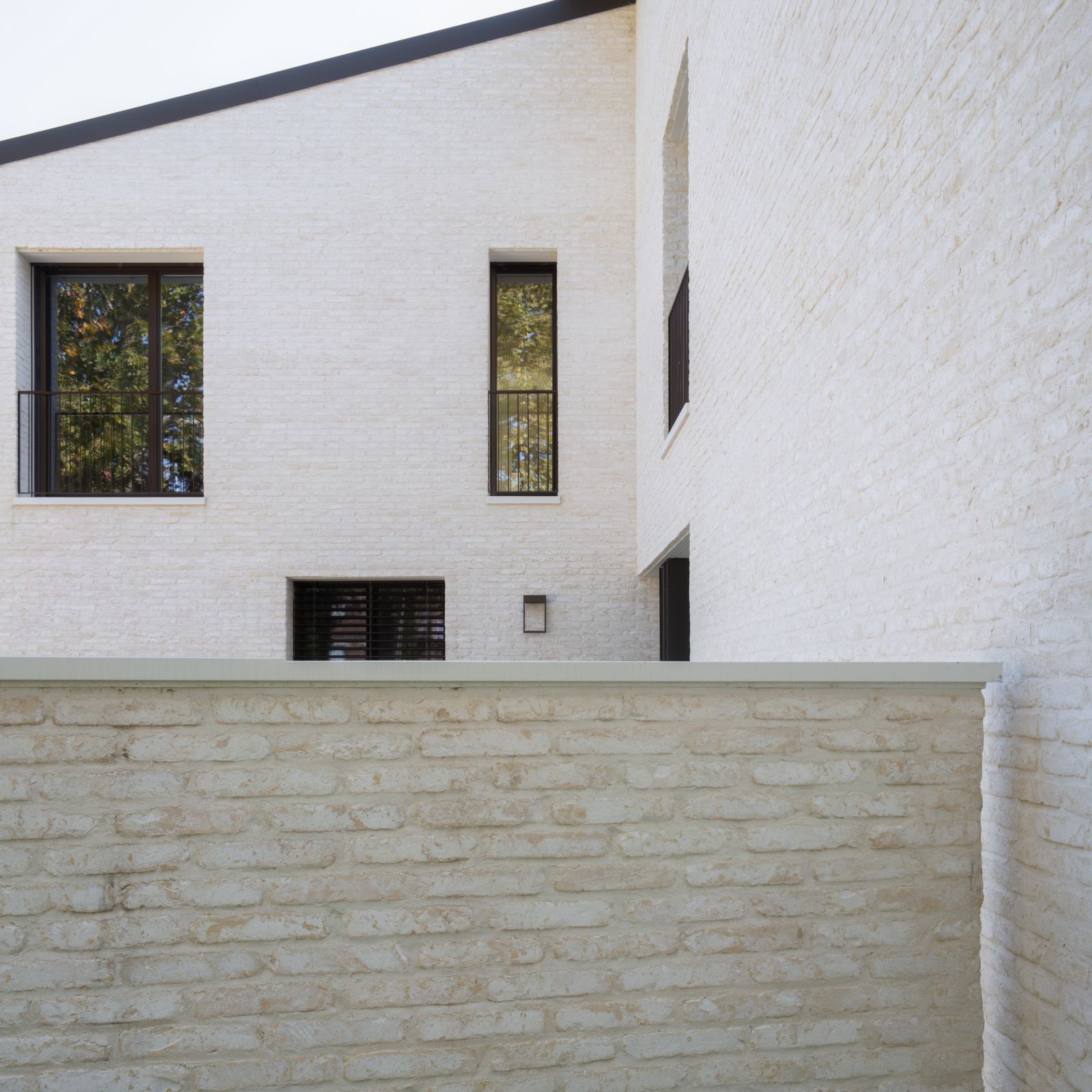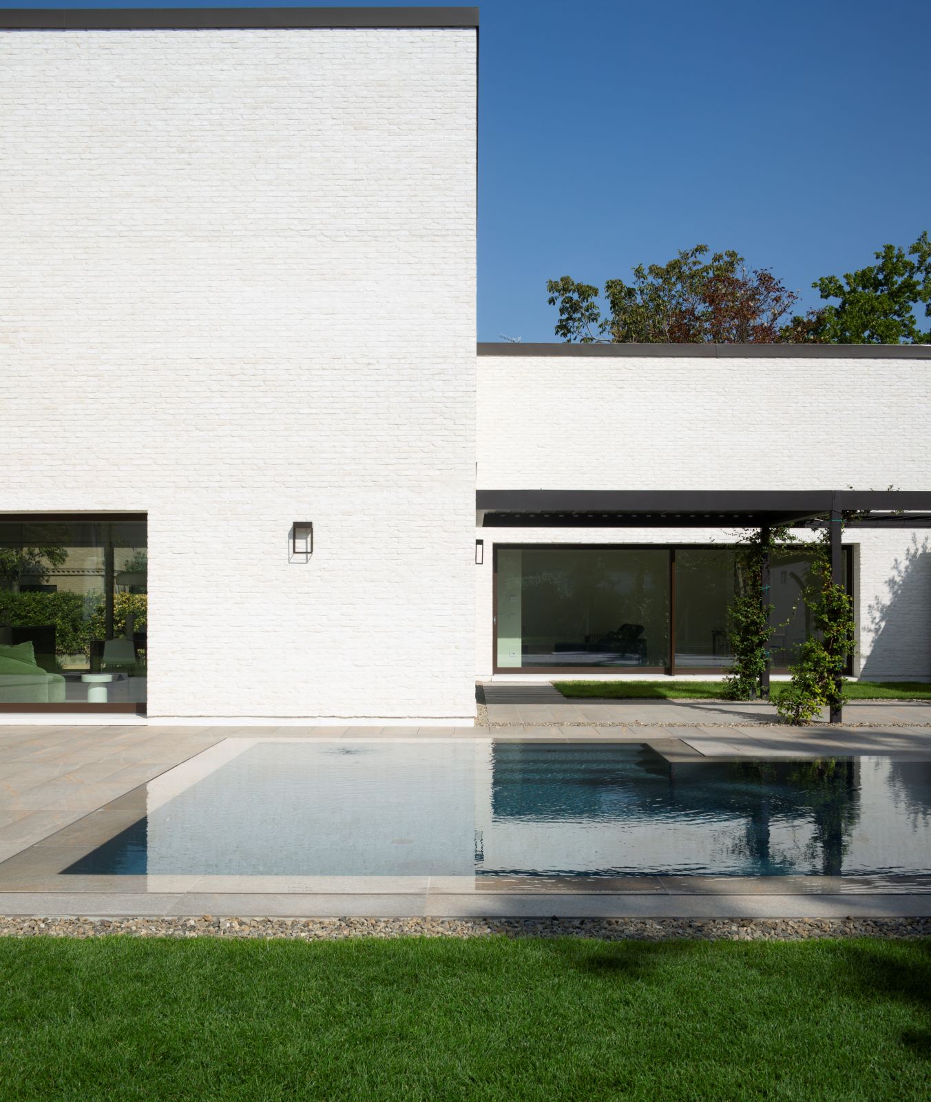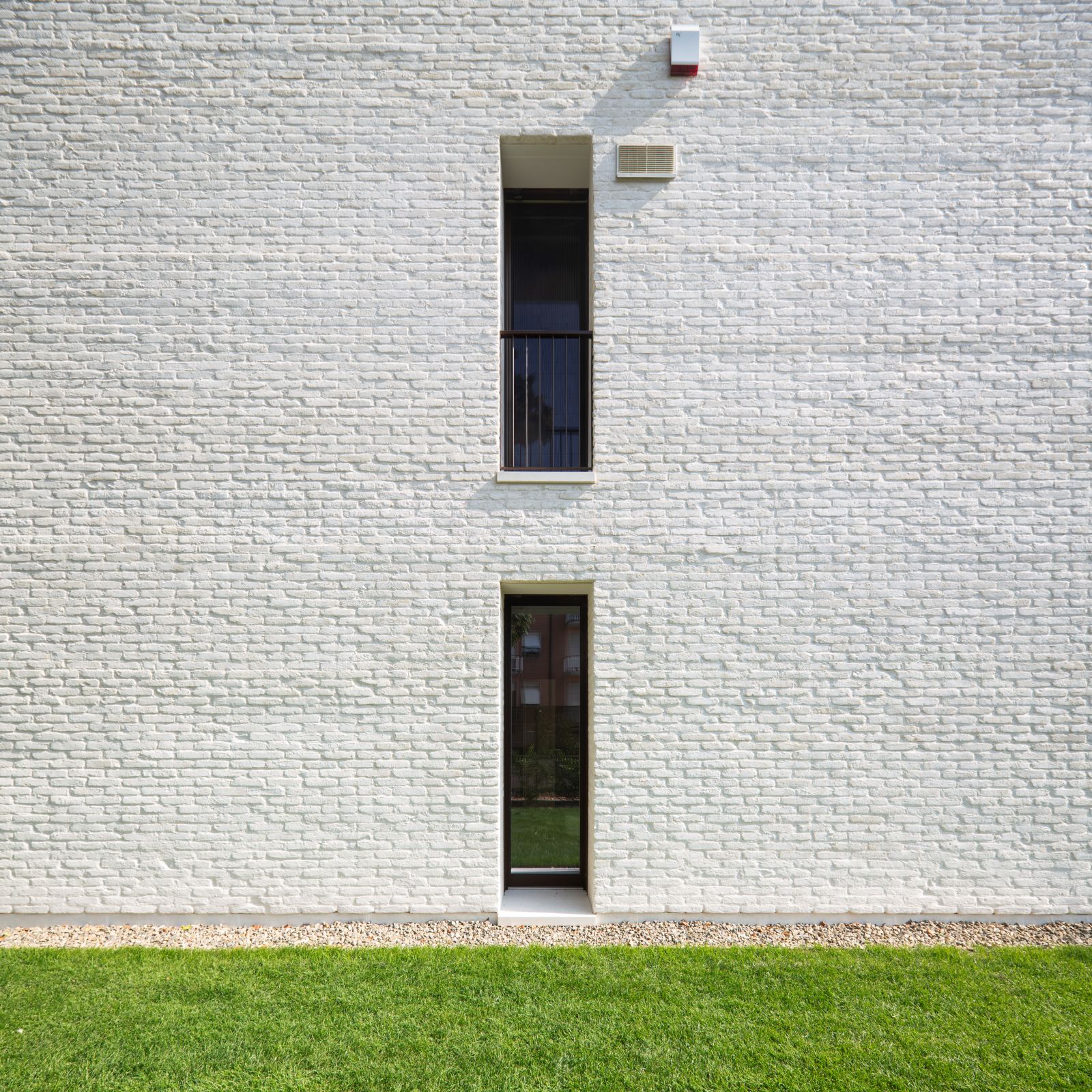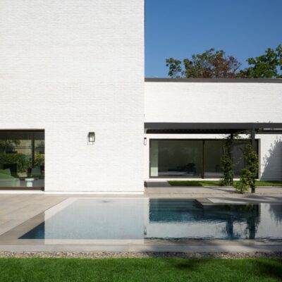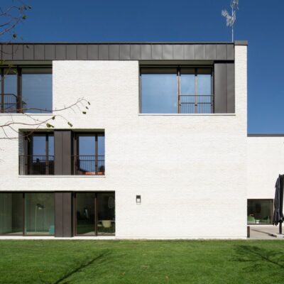 Il volto esterno della Villa MG è caratterizzato dall’utilizzo di un solo materiale, il mattone facciavista utilizzato in tutti i fronti e nei lunghi muri esterni. Si tratta di un mattone burattato e scialbato, Dogi 2.0 scialbato SanMarco di wienerberger, posato con giunti a malta di calce della stessa cromia della scialbatura. Ne deriva un effetto di grande vibrazione della superficie, traduzione contemporanea di un materiale della tradizione costruttiva emiliana, a fronte di una percezione più marcata delle volumetrie che enfatizza l’articolazione volumetrica della casa.