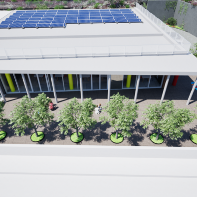 Pensata per i bambini, la facciata principale della mensa è caratterizzata da una vetrata a tutt’altezza. Questo conferisce alla sala un collegamento diretto con l’esterno, luogo del gioco e del tempo libero. Il progetto rispetta i principi del Do No Significant Harm (DNSH) e dei Criteri Ambientali Minimi (CAM) e utilizza materiali e soluzioni progettuali di risparmio energetico come cappotto termico e impianti fotovoltaici.