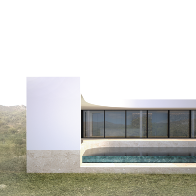 Una serie di pedane rialzate in biancone permettono di arrivare all’ingresso della casa e ospitano, incastonata tra questi spessori, la piscina a sfioro, sul cui lato ricurvo si affacciano la zona per il barbecue e per la cucina all’aperto.