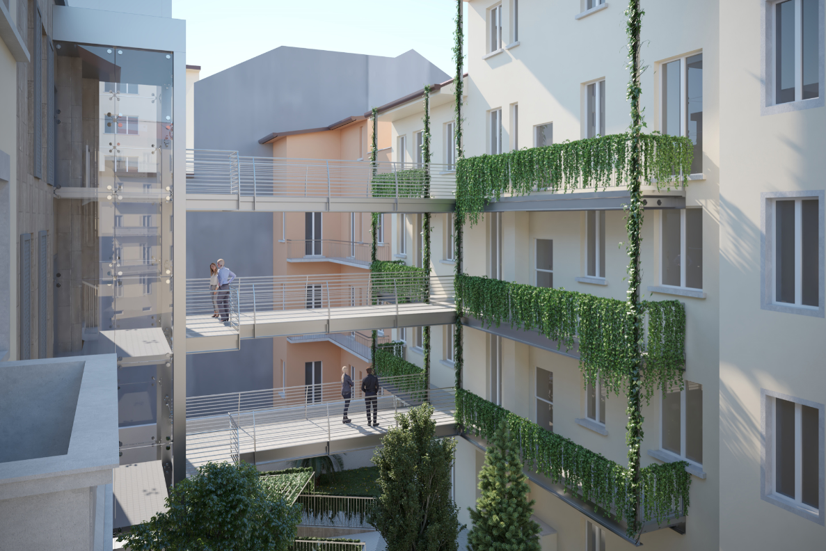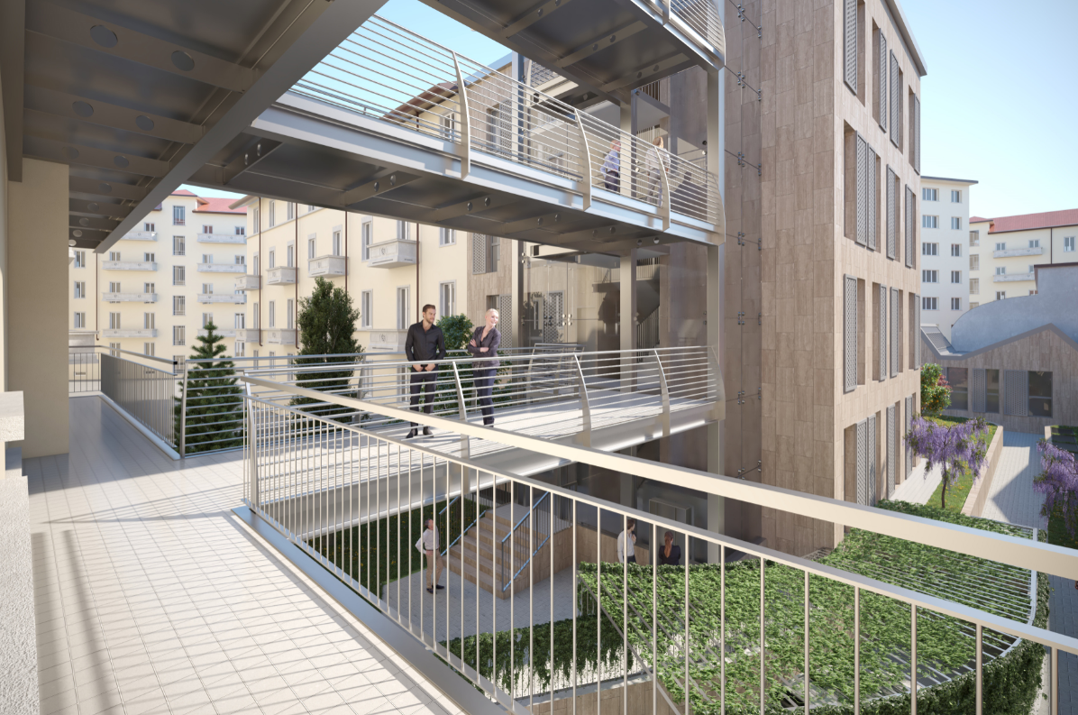 E’ in corso di realizzazione alla struttura un nuovo complesso residenziale, inserito all’interno di un cortile esistente e formato da due edifici: il primo di 4 pft con due livelli interrati per box e cantine, il secondo su un unico piano e caratterizzato da copertura a shed che riprende la conformazione di edifici produttivi preesistenti in disuso e demoliti. Progettazione architettonica e direzione lavori sono dello Studio Guzzo & Partners, progettazione infrastrutture e coordinamento sicurezza di Teknolab & Design e progettazione impianti di Moving mentre l’impresa esecutrice è Lignoalp. Il complesso ha struttura ecosostenibile interamente realizzata in legno Xlam e cappotto termico in fibra di legno, con copertura in lamiera grigia, facciate in gres color travertino con fasce bianche alternate a parti in vetro extra chiaro, serramenti in legno grigio e persiane in alluminio bianche. Il cortile interno è stato ridisegnato con percorsi pedonali, aiuole e aree verdi per creare un ambiente esterno ad uso collettivo per gli abitanti.